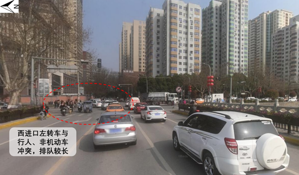 問(wèn)題簡(jiǎn)述:東進(jìn)口雙向2車道,左轉(zhuǎn)和直行相位無(wú)法分設(shè),東西向左轉(zhuǎn)車輛與行人沖突較大,存在排隊(duì)溢出現(xiàn)象。