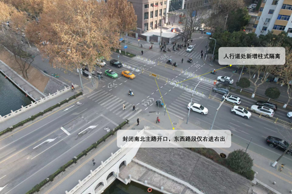 1.上橋匝道由單行調(diào)整為雙行通行,盤道內(nèi)東西向禁左禁直、南北向禁左(7時(shí)至20時(shí),公交車除外);增設(shè)機(jī)非隔離護(hù)欄,分離機(jī)非混行沖突。