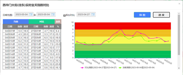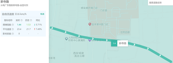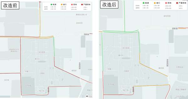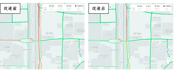 優(yōu)化效果:通過(guò)區(qū)域微循環(huán)改造,新寺路設(shè)置由西向東單行路的措施,唐都醫(yī)院門前就醫(yī)高峰期平均擁堵指數(shù)下降5.71%,平均運(yùn)行速度上升7.49%,緩堵效果明顯。