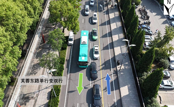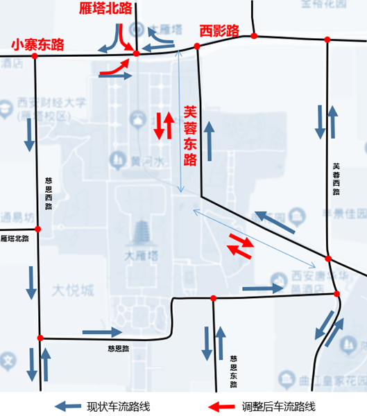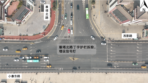 優(yōu)化措施:芙蓉東路(芙蓉西路至西影路段)由南向北單行調(diào)整為雙向行駛,拆除大雁塔北廣場(chǎng)丁字原封閉護(hù)欄,并增設(shè)交通信號(hào)燈,完善路口轉(zhuǎn)向功能。