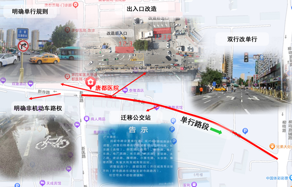 優(yōu)化措施:新寺路(新醫(yī)路至柳鳴路段)由雙向行駛調(diào)整為由西向東單行,施劃雙向非機(jī)動(dòng)車通道、增設(shè)非機(jī)動(dòng)車交通信號(hào)燈保障慢行交通通行路權(quán),對(duì)調(diào)醫(yī)院停車場(chǎng)出入口,同步調(diào)整院內(nèi)交通組織,遷移部分公交站點(diǎn)。