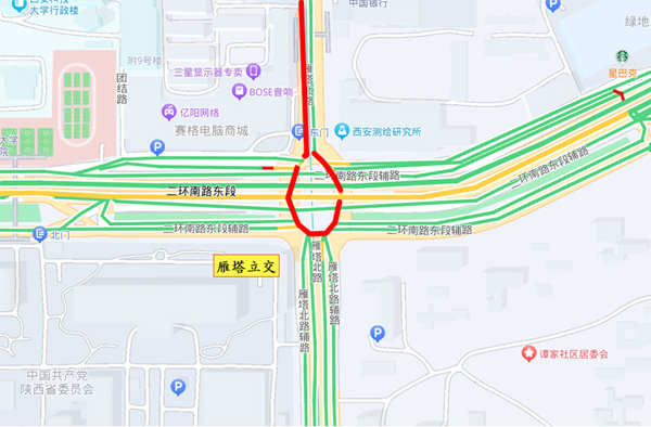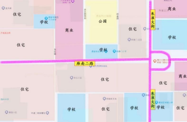 概況:雁南二路為東西向快速路,朱雀大街為南北向主干道,兩條道路相交于明德門遺址公園西側(cè),路口周邊寫字樓、住宅區(qū)、商業(yè)體林立,通過(guò)性與集散性交通流疊加。