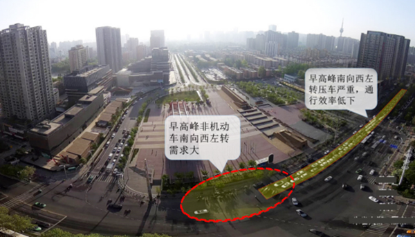 問(wèn)題簡(jiǎn)述:受遺址保護(hù)區(qū)影響,路口采用單向環(huán)島形式,高峰時(shí)段交通壓力極大,中央二次待行區(qū)車流交織嚴(yán)重,溢出問(wèn)題頻發(fā)。