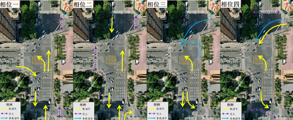 2.信控配時(shí)精細(xì)化:增加南向西左轉(zhuǎn)、東向西直行非機(jī)動(dòng)車專用放行相位,南向西左轉(zhuǎn)車流設(shè)置二次放行模式清空中央二次待行區(qū)排隊(duì)車輛,同時(shí)根據(jù)路口不同時(shí)段的交通特性重新細(xì)化時(shí)段,提升信號(hào)配時(shí)與交通流量的匹配度。
