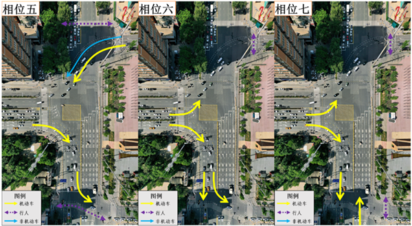 (4)北右轉(zhuǎn)機(jī)動(dòng)車與西北角渠化島行人和非機(jī)動(dòng)車設(shè)置交替放行;取消東西對(duì)向全放相位,保障通行安全。