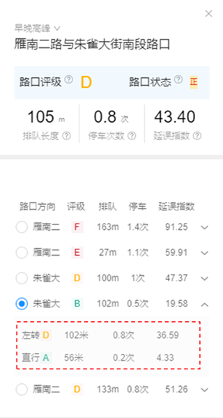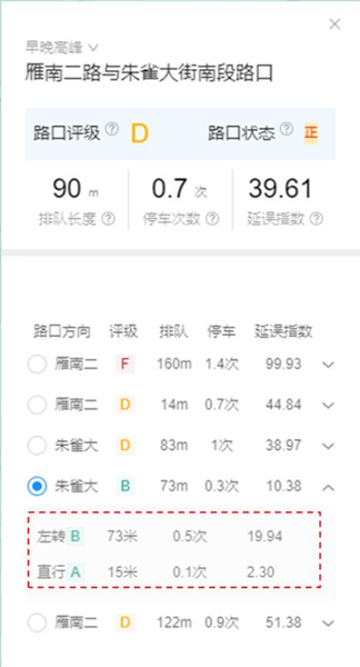 優(yōu)化效果:優(yōu)化后路口整體排隊(duì)長(zhǎng)度由105米縮短至90米(降幅14.28%),平均延誤指數(shù)下降8.73%。其中南向西左轉(zhuǎn)方向優(yōu)化效果最為明顯,健康評(píng)級(jí)由等級(jí)D提升到B級(jí),排隊(duì)長(zhǎng)度由102米下降至73米(降幅28.43%),平均延誤指數(shù)下降45.50%。