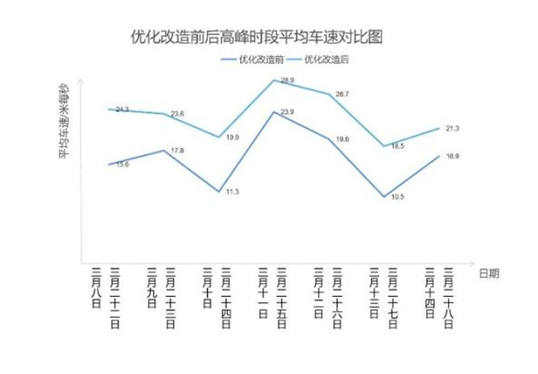 優(yōu)化效果:雙休日、節(jié)假日期間片區(qū)路網(wǎng)擁堵指數(shù)下降26.9%,擁堵時(shí)長(zhǎng)縮短16.98%,平均車速提升31.4%。