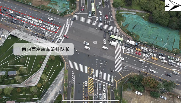 問(wèn)題簡(jiǎn)述:工作日早晚高峰路口南向西左轉(zhuǎn)車流通行需求極大,排隊(duì)溢出至上游路口問(wèn)題頻發(fā)。