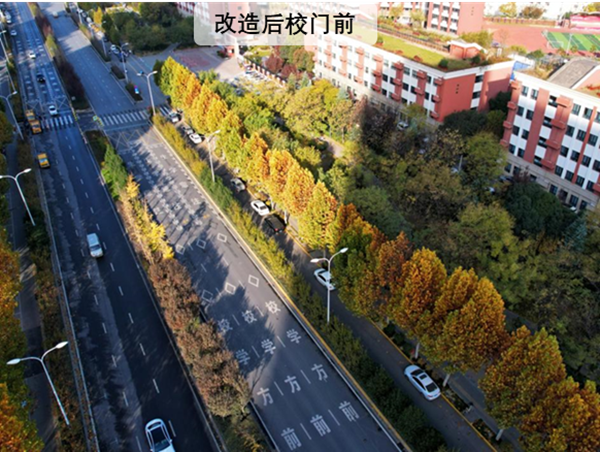 優(yōu)化效果:改造后過(guò)往車輛行車速度得到壓降,安全停車視距得到保障,學(xué)生過(guò)街秩序大幅改善。