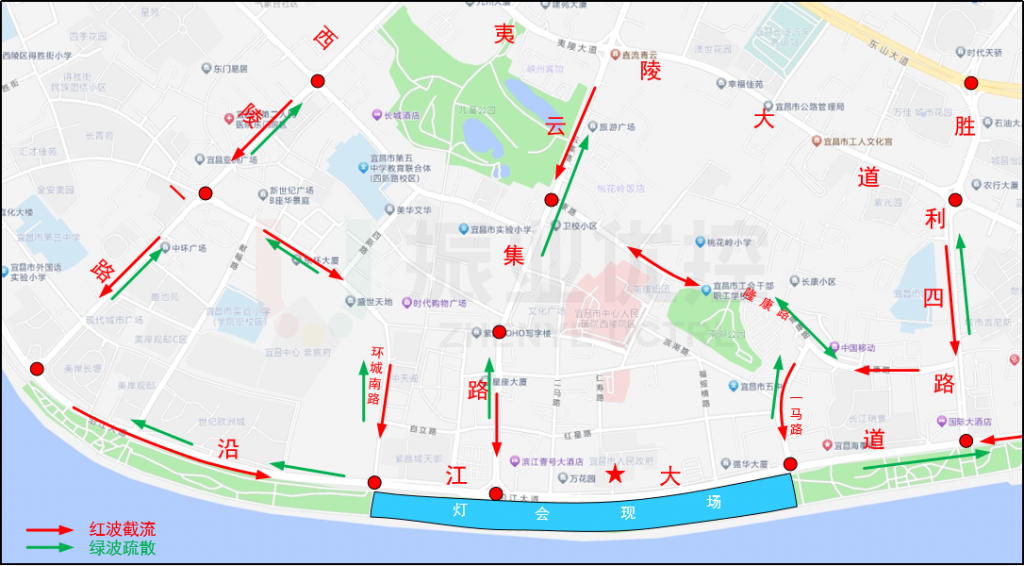 賞燈時(shí)段,針對(duì)大量車流由沿江大道、西陵一路、云集路、勝利四路等關(guān)鍵路段匯入燈會(huì)周邊停車場(chǎng)以及部分車輛離場(chǎng)可能會(huì)出現(xiàn)的車流交織情況,通過(guò)下發(fā)沿線路口配時(shí)方案與節(jié)點(diǎn)路口相序調(diào)整預(yù)案,實(shí)施紅波協(xié)調(diào)控制,分段截流,均衡進(jìn)場(chǎng)車流,避免車流大規(guī)模涌入引發(fā)區(qū)域擁堵;對(duì)離場(chǎng)車流采取綠波協(xié)調(diào),適當(dāng)增加相位時(shí)長(zhǎng),加速車流疏散,達(dá)到“緩進(jìn)快出”的整體控制目標(biāo)。